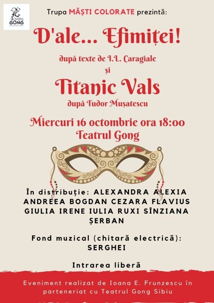 În cadrul programului „Elevi pentru elevi” derulat de actriţa sibiană Ioana Frunzescu în parteneriat cu Teatrul Gong miercuri, 16 octombrie de la ora 18, elevi de la mai multe licee sibiene vor interpreta în premieră o scenetă. Sub titlul „D’ale… Efimiţei” sceneta va include texte de I. L. Caragiale legate apoi de primul act din „Titanic vals”, după T. Mușatescu. Momentul artistic este completat de o interpretare live la chitară electrică de un alt elev.