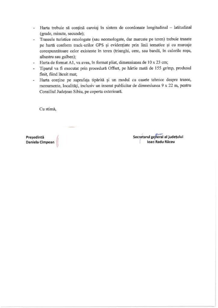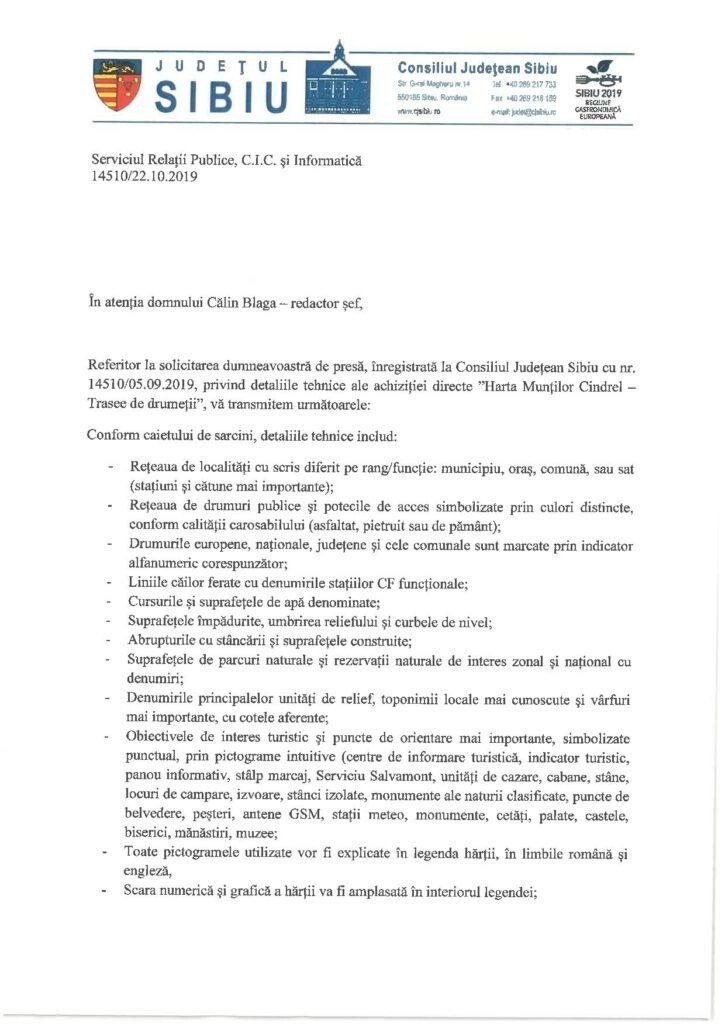 Am interpelat oficial Consiliul Judeţean Sibiu în 1 august despre această achiziţie şi necesitatea ei. Am primit un răspuns oficial abia în 24 octombrie, după multe telefoane şi insistenţe (şi cu surpriza de a vedea că cererea noastră de informaţii apare înregistrată abia în 5 septembrie!!). Iniţial am crezut că CJ a comandat executarea unei hărţi, în sensul realizării de măsurători GPS, trasee etc. Surpiza însă vine în răspuns: CJ a dorit o hartă în format A1, pliată la dimensiunea 10×23 cm, cu sigla Consiliului Judeţean pe ea. Ni s-au comunicat (vezi răspunsul CJ mai jos) caracteristicile cerute în caietul de sarcini, caracteristici tipice pentru orice hartă montană. Nimic deosebit. Din răspuns nu reiese clar de câte exemplare este vorba, deşi am cerut să se justifice necesitatea hărţii şi a costului. Cel puţin aşa reiese din SICAP şi din răspunsul CJ. Anamaria Rad de la firma Schubert & Franzke, care s-a ocupat de contract, ne-a declarat telefonic că nu mai ţine minte exact datele contractului, dar ştie că s-au livrat „cam 1.000 de exemplare” din harta Munţilor Cindrel, tipărită în colecţia Munţii Noştri. Fiindcă am sunat vineri la ora 16.10 dânsa ne-a rugat să revenim luni pentru că la 16 a încheiat programul de lucru. Am trimis un email cu speranţa unui răspuns, dar acesta nu a mai venit de la firmă…