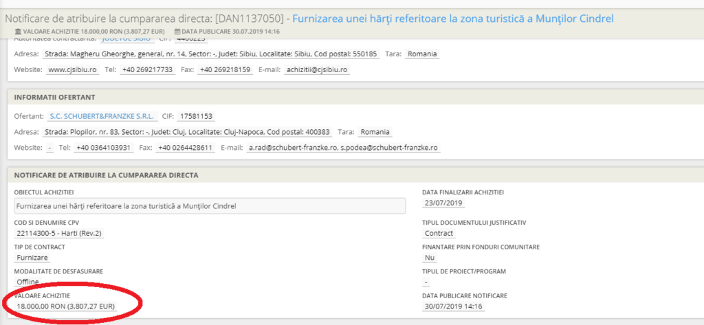 În 30 iulie Consiliul Judeţean Sibiu anunţa pe SEAP că a achiziţionat direct de la firma austriacă Schubert & Franzke, filiala românească de la Cluj, o hartă a munţilor Cindrel în valoare de 18.000 de lei, adică 3.807 Euro! Suma exorbitantă pentru o hartă ne-a atras atenţia, aşa că am început investigaţiile. Şi surprizele au început să apară…