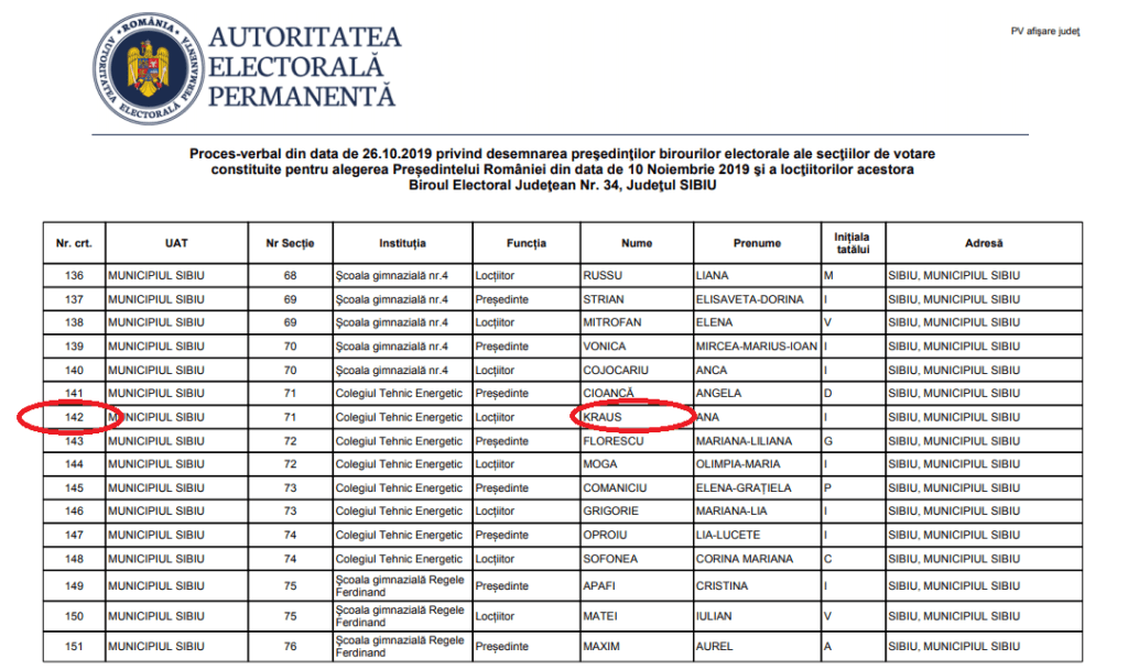 Situaţie incredibilă girată de Biroul Electoral Judeţean Sibiu. Ana Kraus, fost funcţionar în cadrul Consiliului Judeţean Sibiu, judecată pentru fapte penale de abuz în serviciu, conflict de interese, uz de fals și fals în înscrisuri este validată de BEJ Sibiu ca locţiitor al preşedintelui secţiei de vot 142 la alegerile prezidenţiale.
