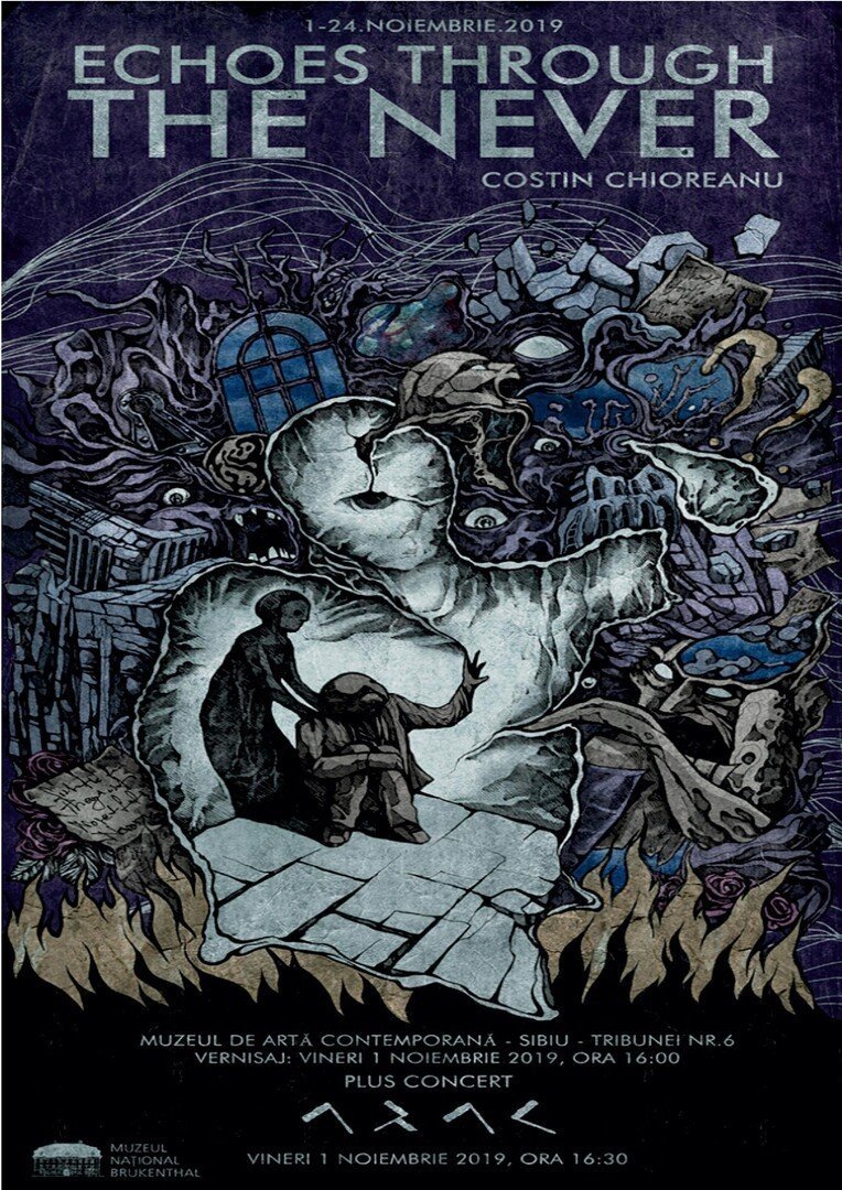 Muzeul de Artă Contemporană din cadrul Muzeului Național Brukenthal, are plăcerea de a vă invita Vineri 1 Noiembrie, ora 16:00 la vernisajul expoziției Echoes Through The Never, semnată de Costin Chioreanu.Născut la 13 Martie 1982, în București, Costin este grafician, designer, artist video și muzician, activând pe plan profesional și expozițional îndeosebi peste hotare. A urmat studiile Universității Naționale de Artă din București, secția Design, însușindu-și studiile universitare de licență și masterat. După definitivarea studiilor și dobândirea experienței profesionale în grafică publicitară de produs, în anul 2003 i-a naștere studioul de grafică, video și design: Twilight13Media. Deși 13 este un număr norocos și încărcat de semnificații pentru Costin, Twilight13Media a luat ființă având la bază: unicitatea stilului grafic dezvoltat de Costin încă de la mijlocul anilor 90ʼ, curajul și devotamentul de a crea grafică de calitate pentru o subcultură, dincolo de metehnele unei industrii orientată doar către câștig și consum.Anterior menționați, anii 90ʼ, cu toate aspectele lor halucinante și convulsive, mai ales pe plan autohton, au adus cu ei în valiza democratică și o penurie de materiale discografice, casete audio, majoritatea copiate și înregistrate departe de un control legal, de unde rezulta și calitatea net inferioară, atât cea a materialului audio dar mai ales a modului de prezentare: coperte xerox (în nici un caz color) ori pur și simplu albe. Bucuria de a te familiariza relativ în timp real cu noutățile muzicale coroborată cu comercializarea revistelor dedicate genului muzical, îndeosebi Heavy Metal Magazine, sunt factorii ce îl determină pe Costin, să își pună talentul și pasiunea pentru desen în slujba realizării unor coperte demne de calitatea muzicii. Dacă se întâmpla să găsească prin vreo revistă un martor vizual pentru coperta de album, acesta realiza o reproducere, dar lucrurile au devenit interesante atunci când în lipsa imaginilor Costin a decis să creeze coperta așa cum și-o imaginase după audiția albumului. Designul pentru propria colecție de materiale audio, un început despre care Costin povestește cu mult umor, are însă relevanță căci în prezent Twilight13Media acoperă o arie vastă în ceea ce înseamnă dimensiunile vizuale ale muzicii metal, de la ilustrarea de coperte și postere, design pentru articole de merchandise până la videoclipuri muzicale filmate sau animații video. Printre cele mai renumite colaborări se numără cele cu : At the Gates, Opeth, Arch Enemy, Darkthrone, Napalm Death, Arcturus, Ulver, Enslaved, Triptykon, Decide, Mayhem, My Dying Bride, Wardruna, Paradise Lost, Sigh, Necrophagia, Ghost.Echoes Through The Never este un proiect menit să evidențieze versatilitatea cu care artistul utilizează varii medii de expresie și modul unic în care găsește mereu noi căi de a redefinii tehnicile mixed-media, au creat un joc spectaculos și dinamic între convențional și neconvențional, între identitatea vizuală standard a muzicii și ceea ce astăzi datorită lui Costin numim vizualul lumii nevăzute. Orice lucrare digitală realizată de Costin, are la bază, drept schelet o grafică convențională: desen în tuș sau creion, acuarelă, tempera ori tehnici mixte; care mai apoi folosind mijloacele digitale capătă dimensiuni complexe prin juxtapunerea de texturi, colaje fotografice sau intervenții de culoare.Arta și tematica abordate de Costin Chioreanu, se desfășoară în parametrii realismului magic, a suprarealismului cu predilecție horror și orientat către oniric. Fie că aduce în atenția publicului lucrări ce ilustrează piese muzicale, ori lucrări a căror tematică este una din sfera personală, ne plasăm în fața unui artist ce posedă un real univers de creație. Un univers populat cu: introspecții ale eului, himere ale prezentului, siluete misterioase ale lumii nevăzute și aluzii ale grandorii naturii creatoare.Considerând că muzica și artele vizuale sunt unelte necesare în procesul de explorare a sinelui, pentru a putea crea și descoperii, pentru a spulbera bariere și limite, Costin va susține după vernisaj un concert alături de band-ul ARAC, în care performează alături de Adrian Tăbăcaru și Sofia Sarri. Momentul muzical va fi unul pe măsura complexității proiectului vizual, garantând valențe sonore ce sparg barierele genurilor muzicale cunoscute, cu un statement clar și anume: căutarea sinelui în comuniune cu natura.