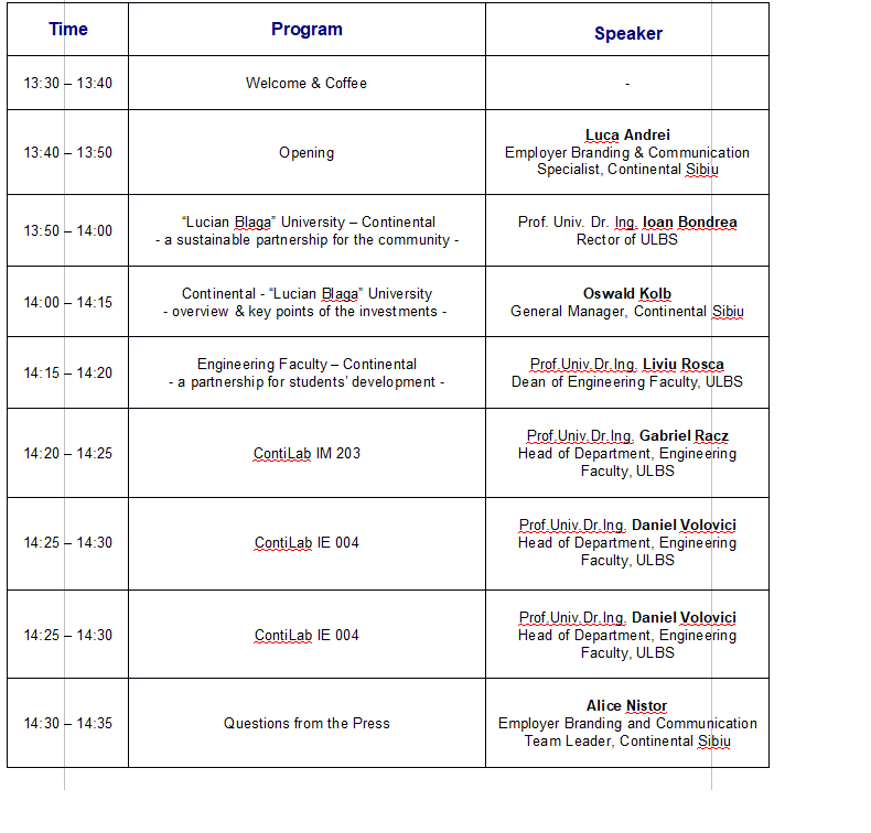 Evenimentul se va desfășura în data 6 noiembrie, începând cu ora 13:30, în aula IE101 a Facultății de Inginerie. La inaugurare vor participa dl. Ioan Bondrea, Rector ULBS, împreună cu conducerea și reprezentanții Facultății de inginerie și reprezentanții Continental Sibiu, printre care Oswald Kolb, Director General al Continental Sibiu, Lacramioara Daraban, Director HR si Liviu Balan, Directorul Centrului de Cercetare si dezvoltare.