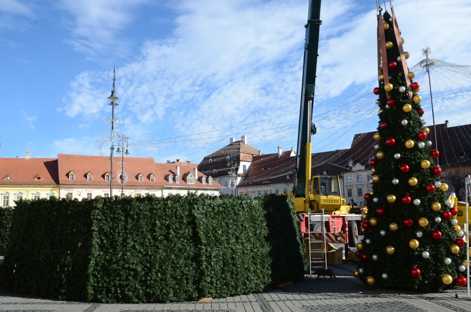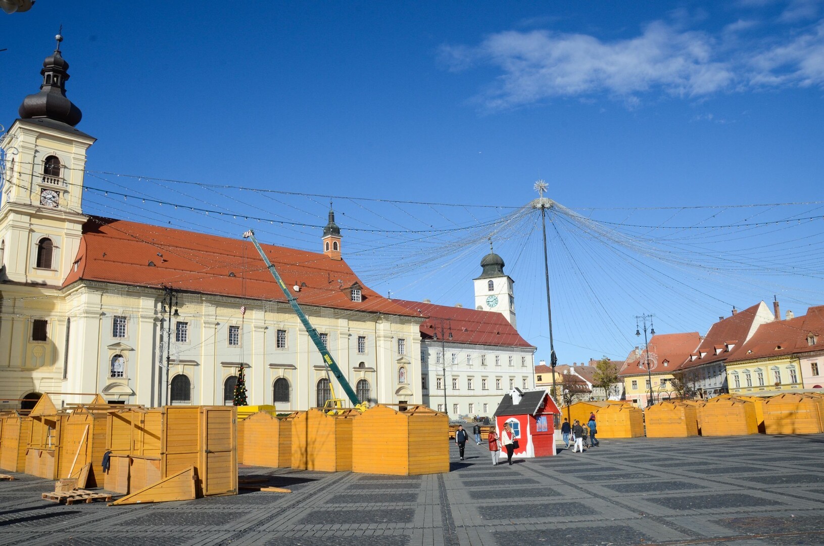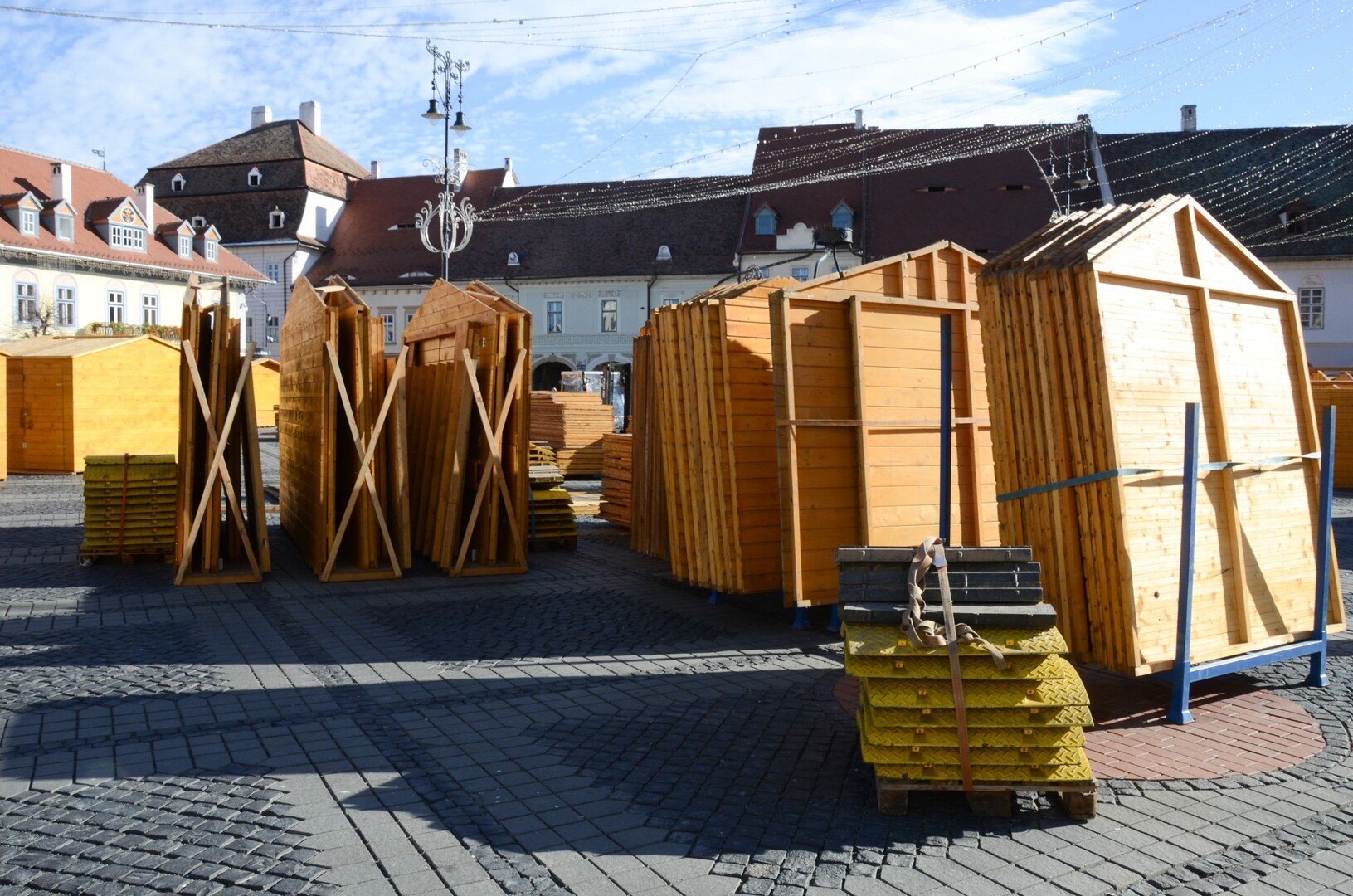 În Piața Mare din Sibiu se lucrează ca într-un furnicar, utilajele duc materiale de construcții, căsuțele sunt montate rând pe rând iar bradul de Crăciun este împodobit și asamblat. Oamenii se opresc și fotografiază pregătirile pentru sărbători, parcă savurând melancolia sărbătorilor.
