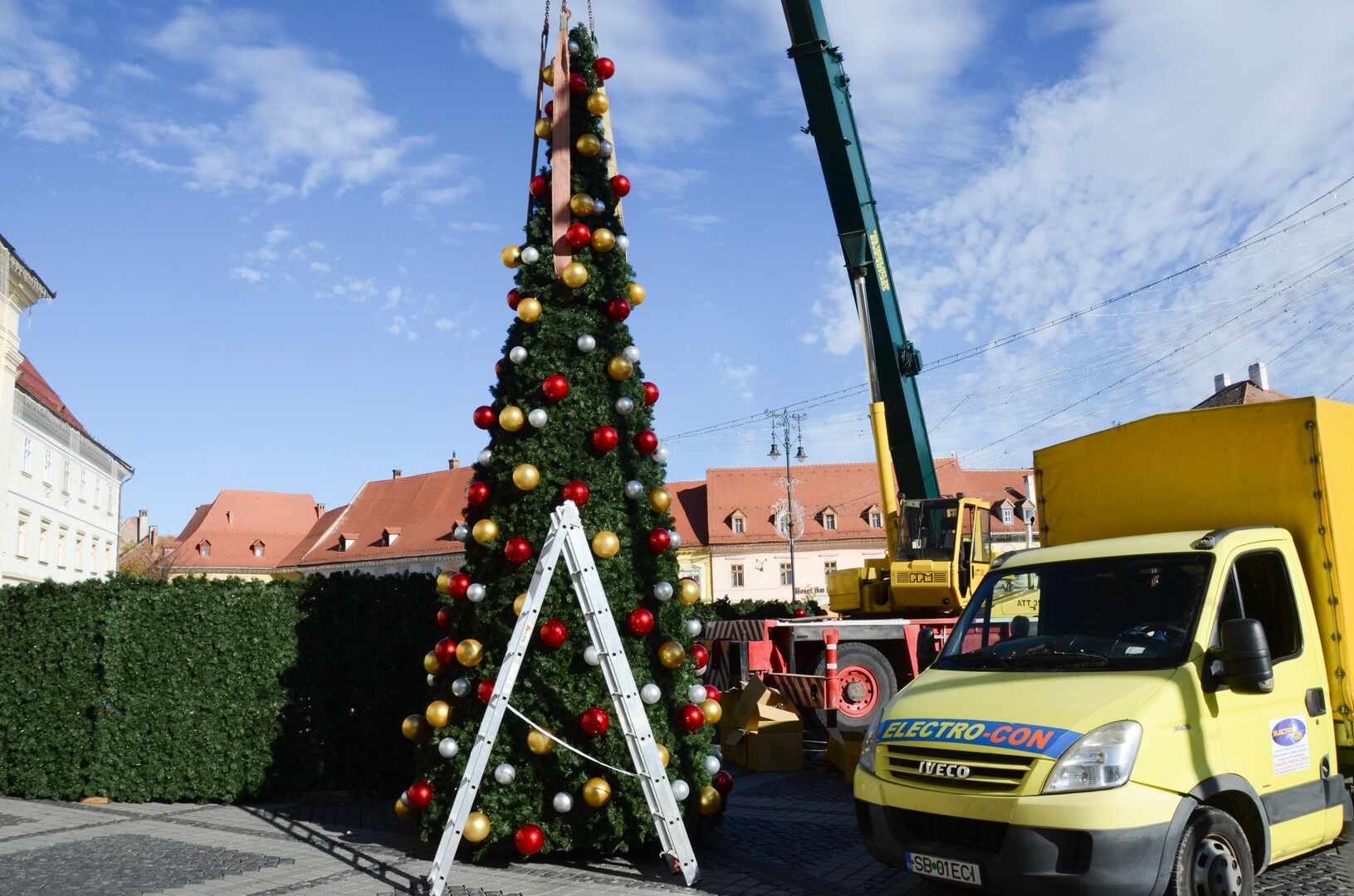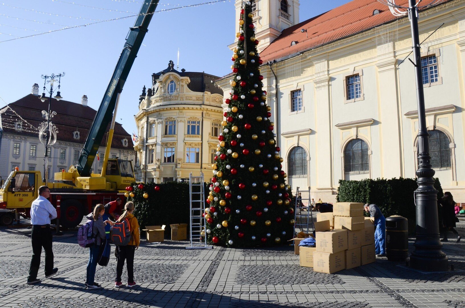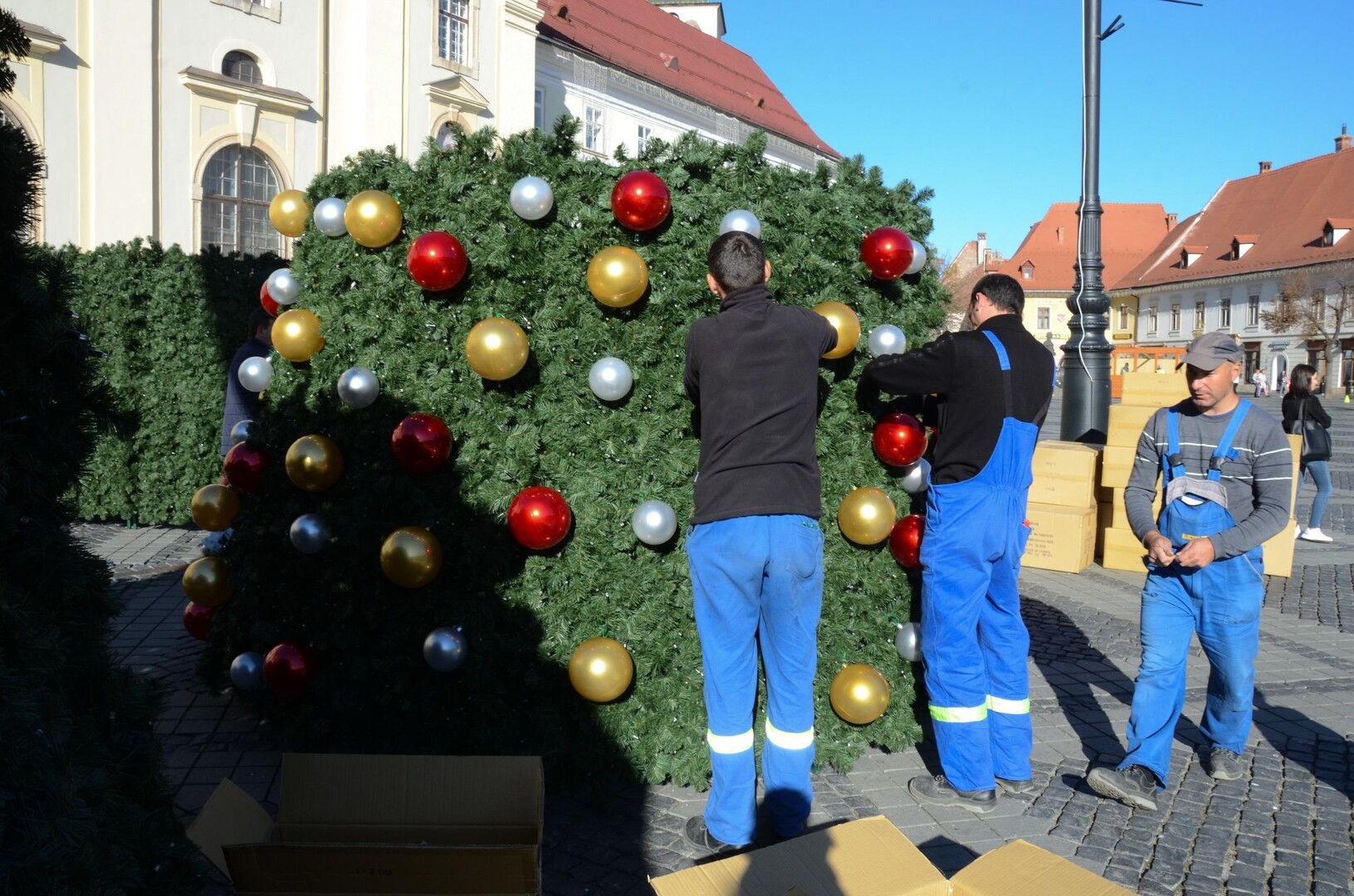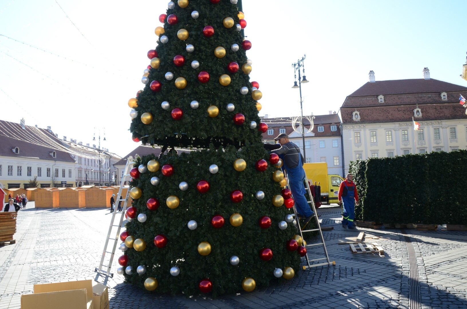 În Piața Mare din Sibiu se lucrează ca într-un furnicar, utilajele duc materiale de construcții, căsuțele sunt montate rând pe rând iar bradul de Crăciun este împodobit și asamblat. Oamenii se opresc și fotografiază pregătirile pentru sărbători, parcă savurând melancolia sărbătorilor.