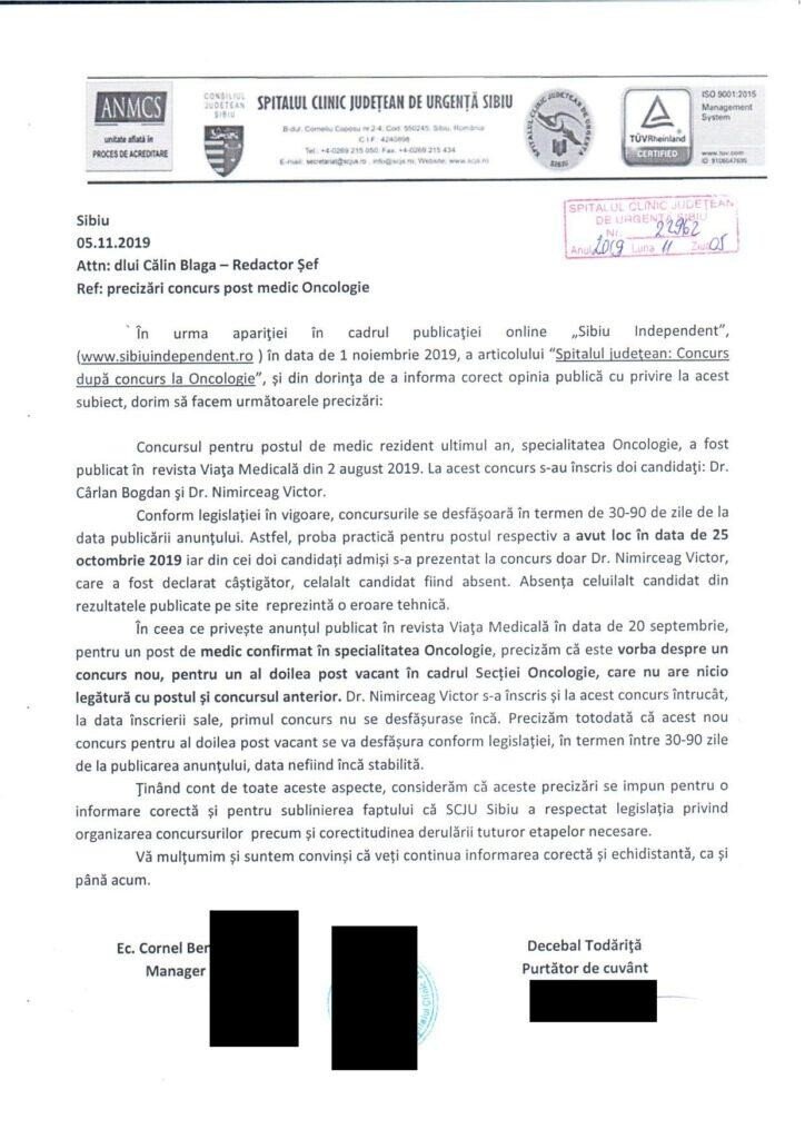 Redăm mai jos răspunsul Spitalului Judeţean Sibiu: