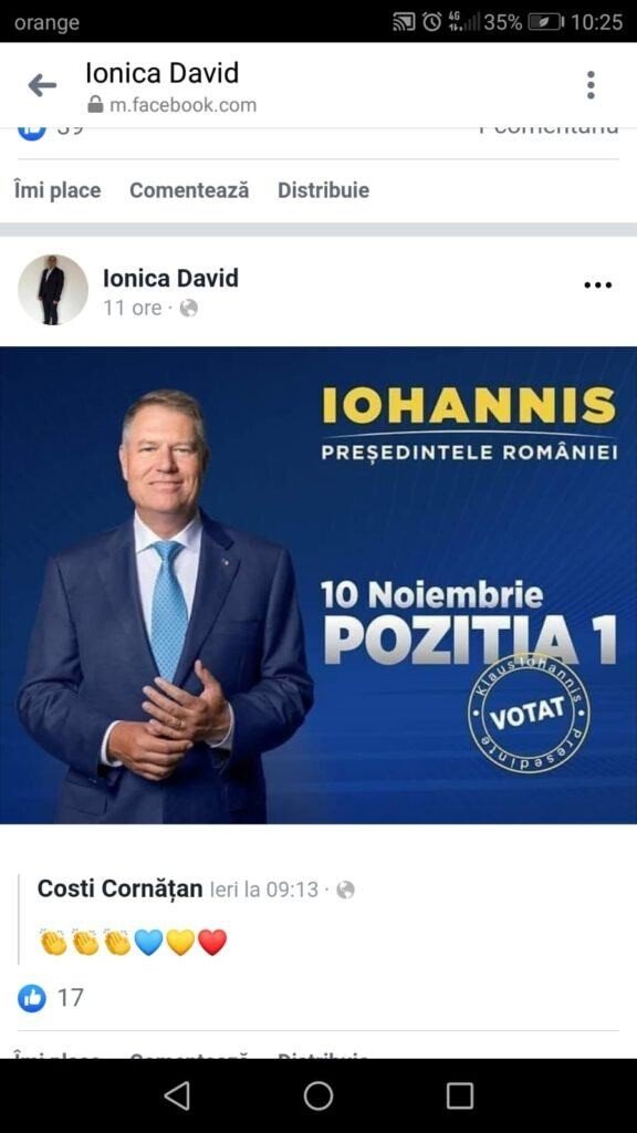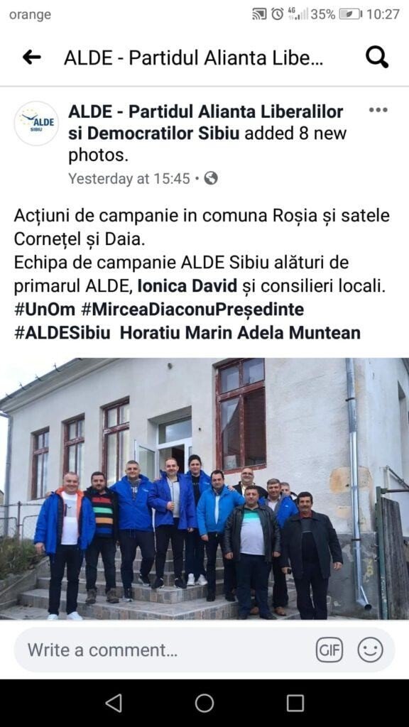Toate suspiciunile au fost spulberate ieri, când primarul din Roşia s-a dat de gol pe Facebook postând un mesaj public de susţinere la alegerile prezidenţiale pentru candidatul PNL, Klaus Iohannis. Asta după ce zilele trecute organizaţia ALDE Sibiu anunţa că a fost prin Roşia alături de primarul Ionică David la împărţit de pliante electorale. Deşi etichetat pe Facebook de organizaţie, primarul a avut grijă ca eticheta şi poza cu ALDE să nu fie publică pe contul său de Facebook. De fapt legătura cu ALDE, primarul a rupt-o imediat după ce s-a văzut ales primar la Roşia, spun sursele noastre.