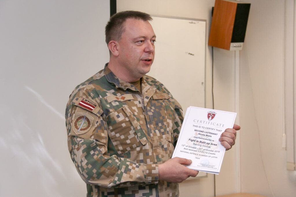 O delegație a Academiei Forțelor Terestre „Nicolae Bălcescu”, formată din sd.sg.maj. Vlad Daniel Moşneag şi sd.cap. Ştefan Petre şi coordonată de către plt.adj. Marius Băcilă, a participat, în perioada 13-25 octombrie, la modulul internaţional de pregătire “Fight in Built up Area”, organizat de Academia Naţională de Apărare din Riga, Letonia. Evenimentul, la care au participat 19 cadeţi din Austria, Cehia, Estonia, Georgia, Italia, Letonia, Lituania, Polonia şi România, s-a desfăşurat în două etape, cea teoretică, cu durata de o zi, şi cea practică, desfăşurată pe parcursul a şapte zile.