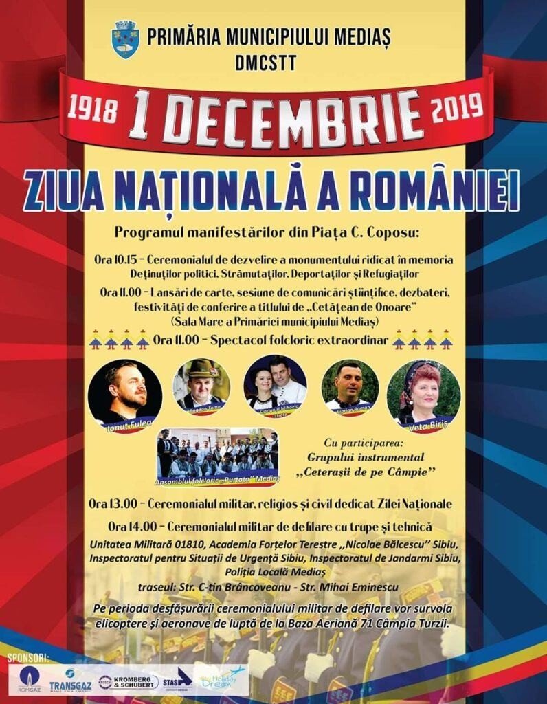 1 Decembrie, Ziua Națională a României va fi celebrată în municipiul Mediaș printr-o serie de manifestări culturale, ceremonialuri religioase, militare, civile și spectacole de muzică populară, dedicate Sărbătorii Marii Uniri de la 1918, independenței și integrității Statului Român modern.