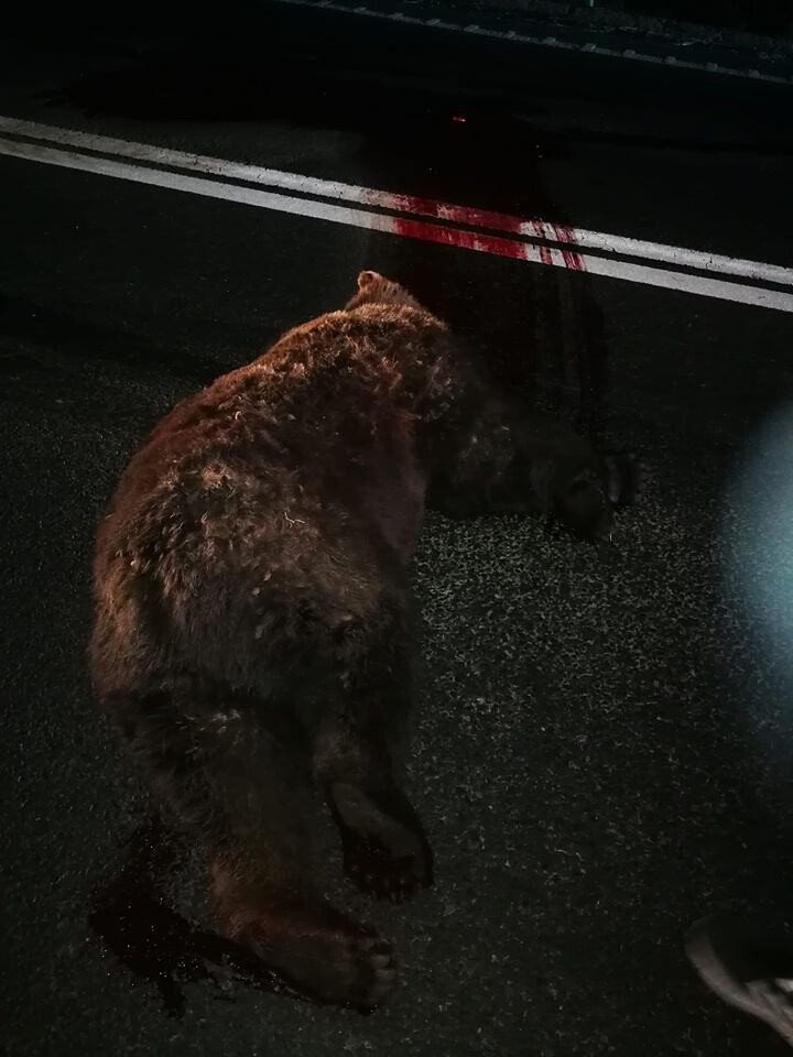 „O ursoaică a fost lovită mortal de un autoturism pe DN1, km. 290+800m (Hula Bradului spre Bradu). Autoturismul prezintă daune materiale, nu sunt persoane rănite. „