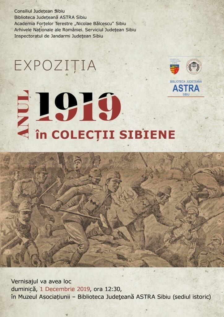 Cu prilejul sărbătoririi Zilei Naționale a Românei, duminică, 1 Decembrie 2019, începând cu ora 12:30, Biblioteca Județeană ASTRA Sibiu invită publicul la vernisajul expoziției Anul 1919 în colecții sibiene, care va avea loc la Muzeul Asociațiunii din sediul istoric al bibliotecii (Corp A).