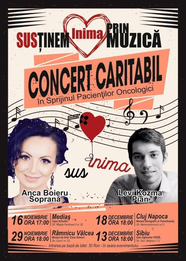 Asociația “Sus Inima” invită sibienii la concertul caritabil “Susținem inima prin muzică” în data de 13 decembrie, la Sala Oglinzilor din cadrul Forumului German, începând cu ora 18:00, alături de soprana Anca Boieru și pianistul Levente Cozma.
