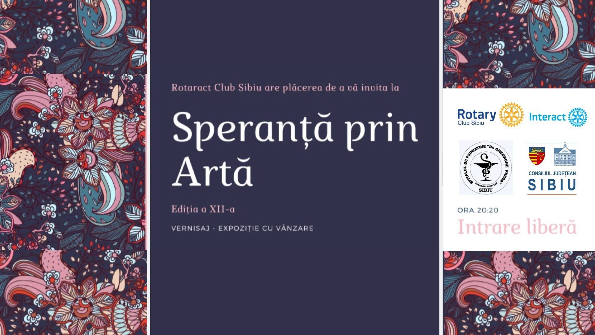 Speranță prin Artă a ajuns la ediția a XII-a, iar Rotaract Club Sibiu și Rotary Club Sibiu, în colaborare cu Spitalul de Psihiatrie „Dr.Gh.Preda” din Sibiu, au plăcerea de a vă invita Miercuri, 18 Decembrie 2019, orele 20:20, la Forumul German ( Str. General Magheru w 2), Sala Oglinzilor, unde va avea loc vernisajul expoziției de pictură, desen, ceramică și articole decorative și de asemenea, un concert caritabil.