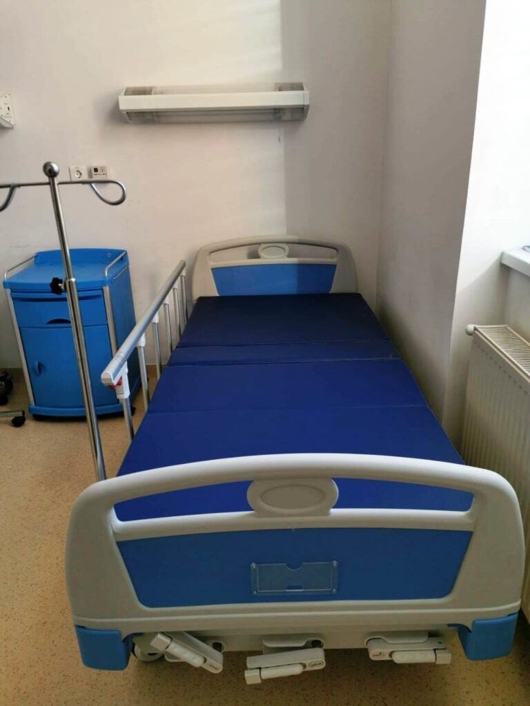 Paturile sunt echipate cu roți cu frână, suport de perfuzie ajustabil iar picioarele sale nu sunt situate la acelaşi nivel cu cadrul tăbliilor ci în interiorul suprafeţei destinate pacientului față de ramele patului, pentru a preveni lovirea de către pacient, vizitatori și personalul medical. Confortul pacientului este asigurat prin posibilitatea de ridicare în unghi de 35° pentru picioare și de ridicare în unghi 75° a suportului pentru spate. Saltelele în trei secțiuni achiziționate asigură un confort deosebit pacientului, fiind confecționate din spumă poliuretanică cu un grad ridicat de elasticitate. Sunt prevăzute cu husa lavabilă din piele ecologică (poliester peliculizat), detașabilă, cu fermoar. Noptiera pe roți și structură de aluminiu este una foarte utilă, concepută pentru mai multe destinații și prevăzută cu tavă tip masă pliabilă cu decupaj de pahare, sertar glisant, spațiu de depozitare cu poliță si ușă din plastic ABS. Noptiera mai este dotată, pe ambele laterale cu suport de prosop.