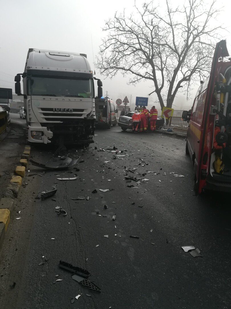 Un accident de circulație s-a produs între un TIR și un autoturism. Din primele informații sunt două victime incarcerate. Se pare ca o victimă este inconștientă.