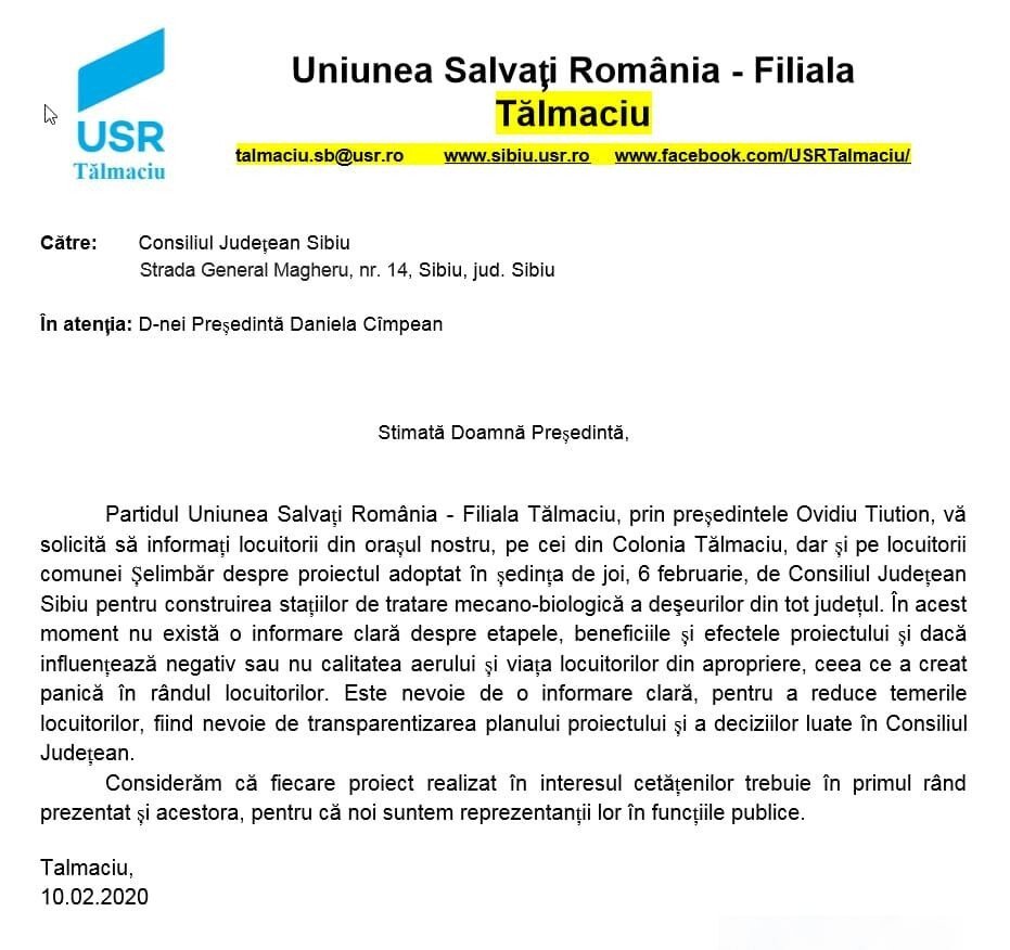 Organizaţia USR Tălmăciu a trimis astăzi o solicitare Consiliului Județean Sibiu pentru a cere informații despre proiectul de construire a stațiilor de tratare a deșeurilor din județ lângă Colonia Tălmaciu. „Cerem informații despre etapele proiectului, beneficii, efecte negative și dacă influențează calitatea aerului și viața locuitorilor din zonă. Este nevoie de o informare clară, pentru a reduce temerile locuitorilor, fiind nevoie de transparentizarea planului proiectului și a deciziilor luate în Consiliul Județean” au declarat reprezentanţii USR Tălmaciu.
