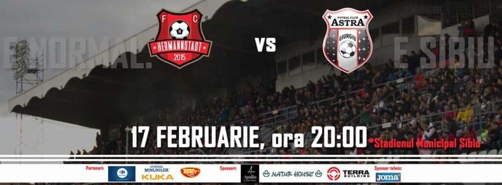 De când am revenit pe municipalul sibian, nu am pierdut nici o partidă pe teren propriu! Haideți alături de echipă pe stadion! Haideți să fim împreună încă o dată! Haideți pentru Sibiu! Haideți pentru FCH! Sibiul are fotbal! Bilete disponibile aici: https://www.bilete.ro/afc-hermannstadt-afc-astra-giurgiu-casa-liga-1/afc-hermannstadt-afc-astra-giurgiu-casa-liga-1-17-feb-2020 FCH – au anunțat reprezentanții FCH pe pagina de facebook.