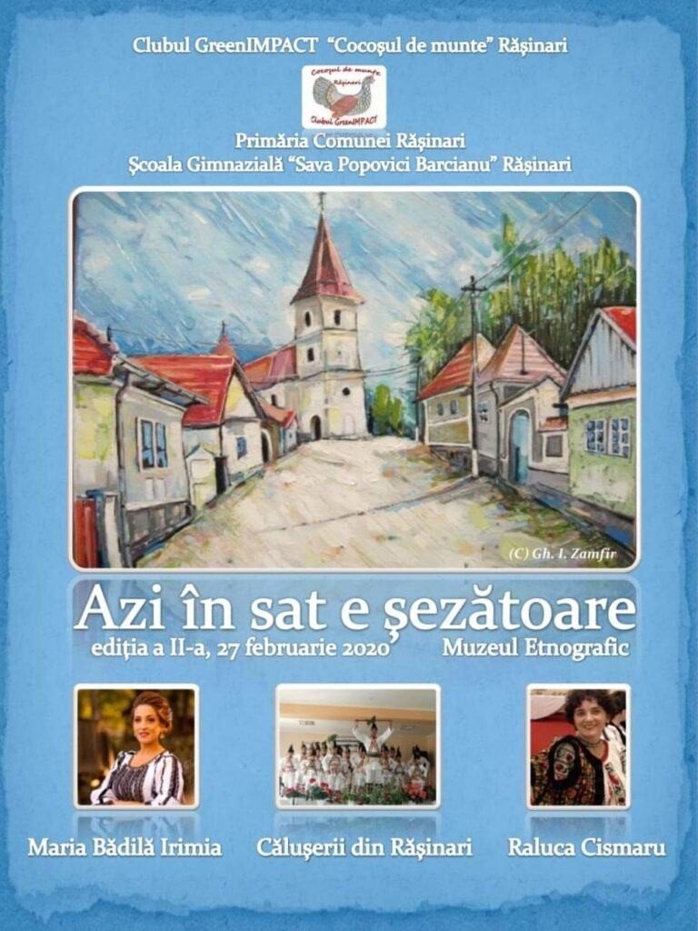 Joi, 27 februarie 2020 Clubul GreenIMPACT „Cocoșul de munte” alături de Primăria Comunei Rășinari și Școala Gimnazială „Sava Popovici Barcianu” Rășinari va organiza ediția a II-a a evenimentului „Azi în sat e șezătoare” , eveniment la care vor fi prezenți Maria Bădilă Irimia, Călușerii din Rășinari și Raluca Cismaru. Evenimentul va avea loc în sala mare a Muzeului Etnografic din Rășinari.