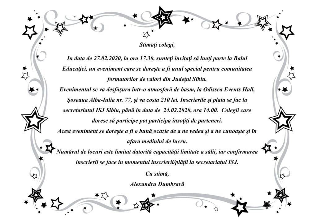 Inspectorul şcolar general Alexandru Dumbravă a trimis o invitaţie tuturor cadrelor didactice din judeţ pentru a participa la prima ediţie a Balului Educaţiei. Evenimentul va avea loc în 27 februarie de la ora 17.30 la Odissea Events Hall (lângă Aeroport).