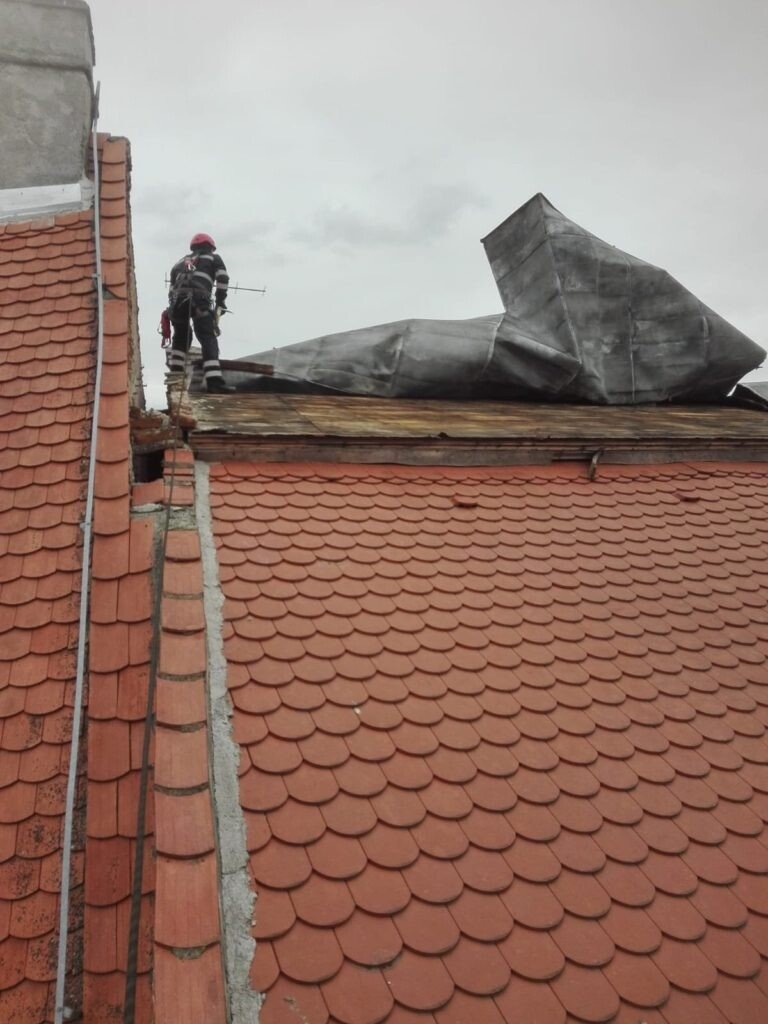 ISU Sibiu intervine de urgență cu un echipaj de pompieri militari și autospeciala de salvare de la înălțime în municipiul Sibiu, zona str. Nicolae Bălcescu pentru îndepărtarea unei suprafețe de tablă de pe acoperișul unui imobil care prezintă pericol de desprindere din cauza condițiilor de vânt puternic existente.