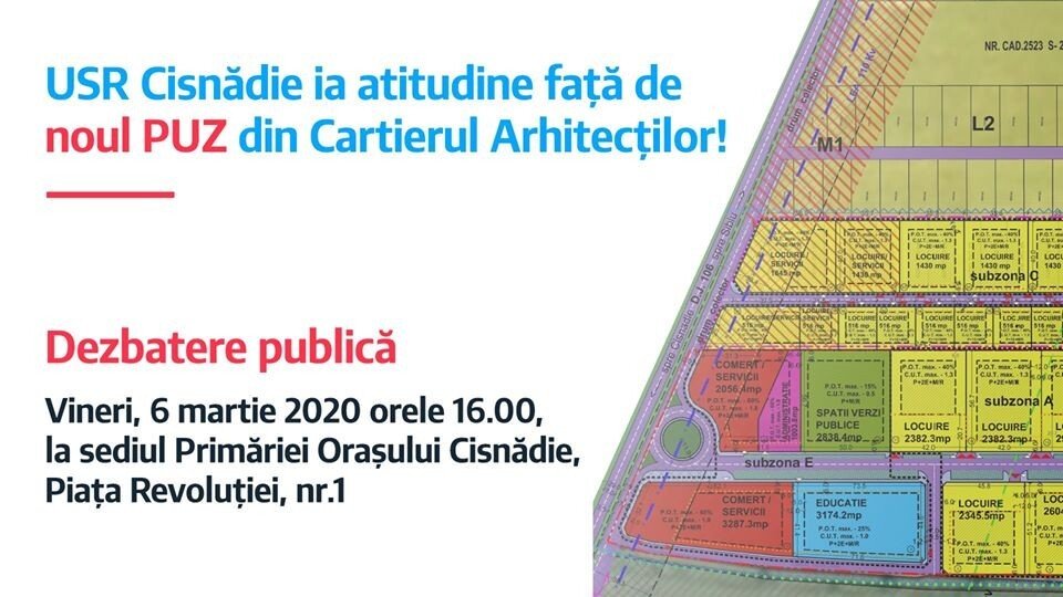 USR Cisnădie a trimis către mass-media un punct de vedere asupra PUZ-ului din Cartierul Arhitecților îi invită pe cetățeni să participe la Dezbaterea Publică pe acest subiect, organizată de către APM Sibiu la Primăria Cisnădie în data de 6 martie 2020 orele 16:00.