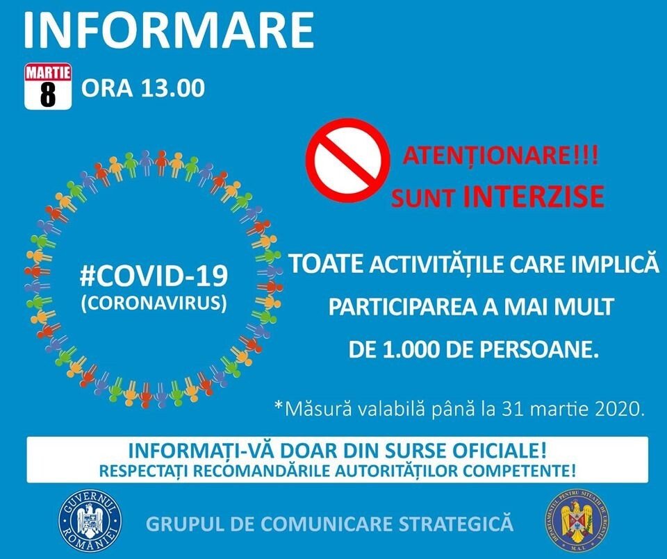 Începând de astăzi, 8 martie 2020, sunt interzise manifestările publice sau private, în spații deschise sau închise, cu un număr de participanți mai mare de 1000 de persoane.