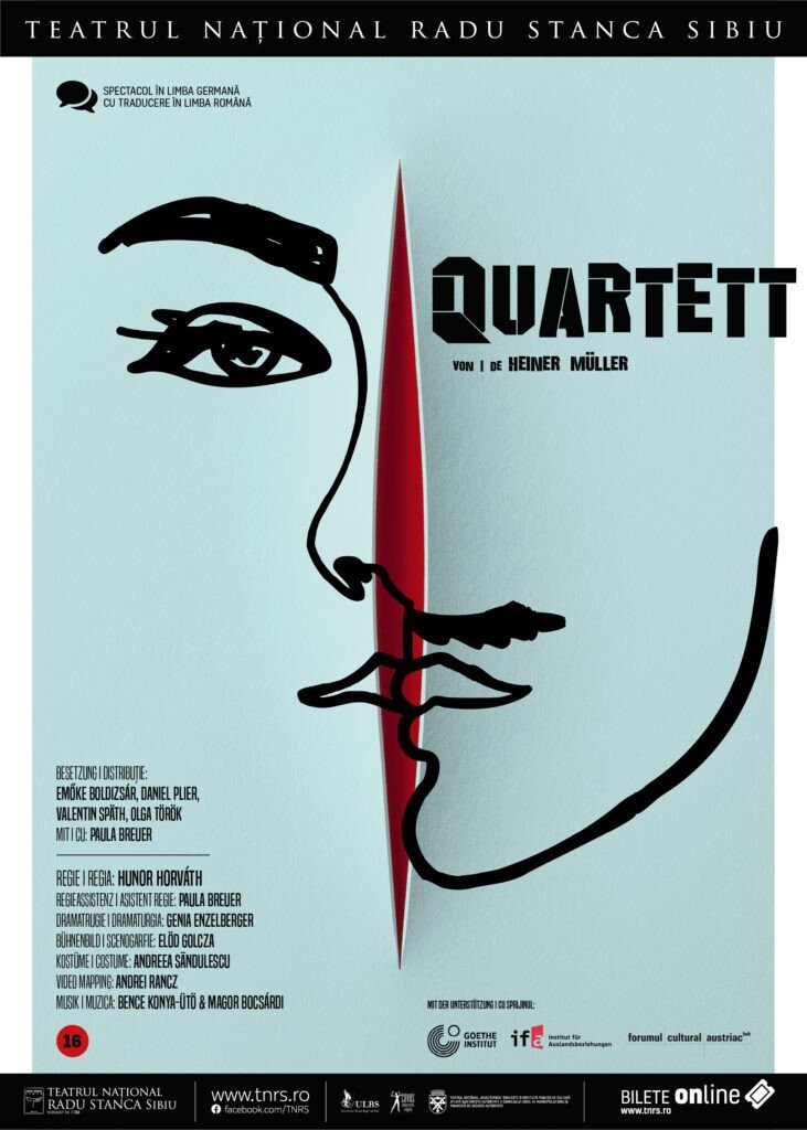 Cel mai nou spectacol al Teatrului Național „Radu Stanca” Sibiu, „Quartett”, de Heiner Müller, produs la secția germană, în viziunea scenică a tânărului regizor Hunor Horváth, ne aduce împreună în contextul apocaliptic al unui „salon înaintea Revoluției Franceze” sau al unui „buncăr după cel de-al Treilea Război Mondial”, alături de Marchiza de Merteuil și fostul ei iubit Vicontele de Valmont, personajele romanului epistolar „Legături primejdioase” de Choderlos de Laclos. Textul dă șansa, celor două personaje, interpretate pe rând de Emőke Boldizsár, Daniel Plier, Valentin Späth și Olga Török, unei ultime confruntări. Spectacolul, realizat în parteneriat cu Goethe Institut București și Forumul Cultural Austriac București, și susținut de IFA (Institutul pentru Relații Externe Germania), va fi prezentat în avanpremieră joi, 12 martie 2020, premiera urmând a avea loc vineri, 13 martie 2020, la TNRS – Sala Studio (Str. Emil Cioran. Nr. 1A)