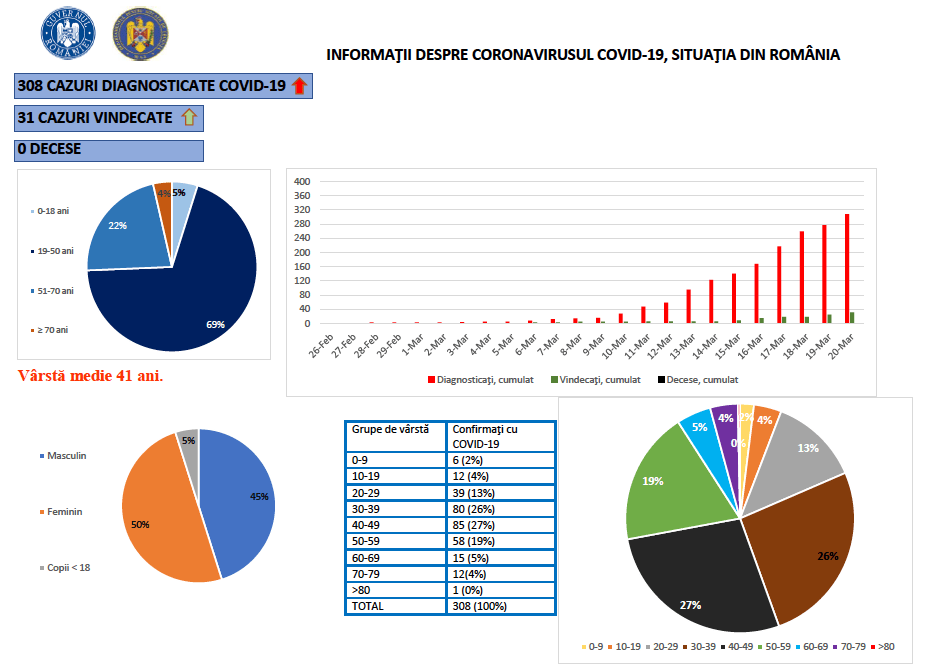 Până astăzi, 20 martie, pe teritoriul României, au fost confirmate 308 cazuri de persoane infectate cu virusul COVID – 19 (coronavirus).