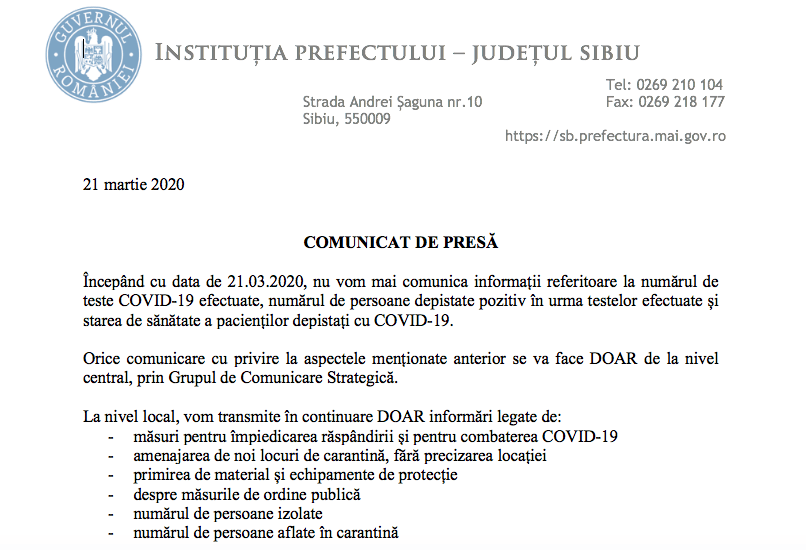 Prefectul județului Sibiu dar și ceilalți prefecți din țară NU MAI AU VOIE de astăzi, 21 martie 2020, să comunice numărul de teste, numărul de persoane depistate pozitiv sau starea lor.