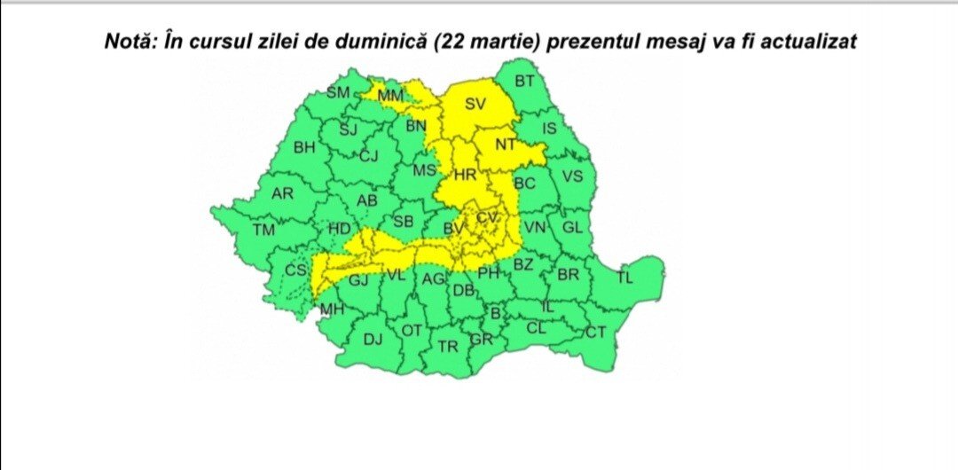 În noaptea de sâmbătă spre duminică (21/22 martie) și în cursul zilei de duminică (22 martie) aria precipitațiilor predominant sub formă de ninsoare va cuprinde cea mai mare parte a zonei montane și local Transilvania, Maramureș și Moldova. Din a doua parte a nopții de duminică spre luni (22/23 martie) precipitațiile se vor transforma în lapoviță și ninsoare în cea mai mare parte a țării și se va depune strat de zăpadă, mai consistent îndeosebi în zonele de munte și în regiunile sudice. Izolat vor fi posibile depuneri de polei. Temporar vântul va prezenta intensificări în majoritatea regiunilor, în general cu viteze de 50960 km/h, iar pe crestele montane va sufla tare, viscolind și spulberând zăpada.