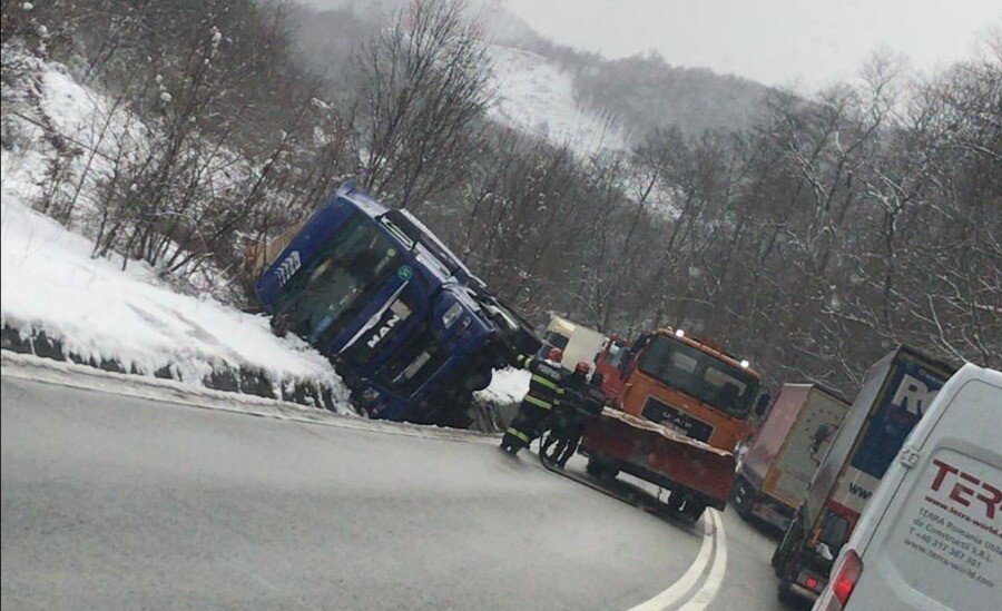 Un autocamioan a derapat și a intrat într-un șanț de pe Valea Oltului. Cel mai probabil evenimentul rutier s-a produs din cauza neadaptării vitezei la condițiile meteo.