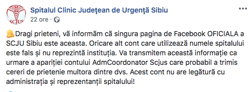 Spitalul Clinic Judeţean de Urgenţă Sibiu a postat pe pagina oficială de Facebook un mesaj prin care atrăgea atenția asupra unor conturi false care trimit cereri de prietenie diverselor persoane.