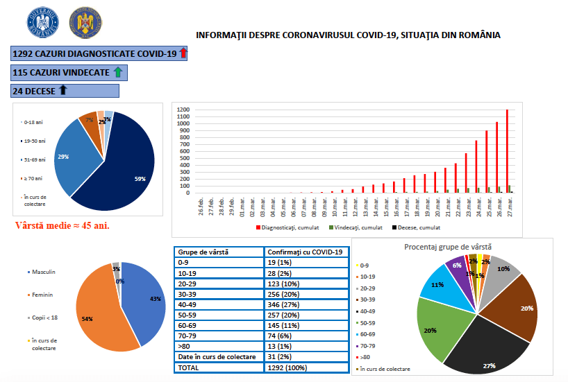 Până astăzi, 27 martie, pe teritoriul României, au fost confirmate 1.292 de cazuri de persoane infectate cu virusul COVID – 19 (coronavirus).