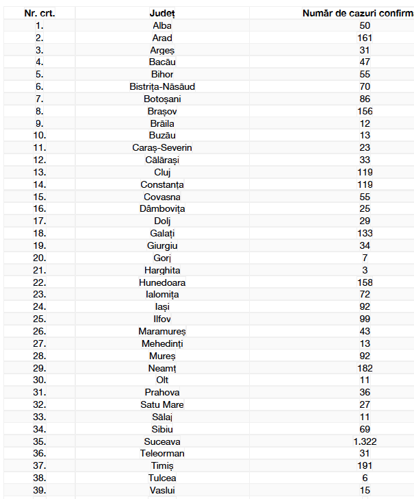 Totodată, până acum, 182 de persoane diagnosticate cu infecție cu COVID-19, internate în spitale din Dolj, București, Iași, Suceava, Arad, Bacău, Timiș, Cluj, Neamț, Hunedoara, Constanța, Satu Mare, Sibiu, Ialomița, Bistrița-Năsăud, Covasna, Dâmbovița, Vrancea, Galați, Caraș-Severin, Mureș, Giurgiu, Bihor, Argeș, Vaslui, Botoșani, Alba, Sălaj și Mehedinți, au decedat.
