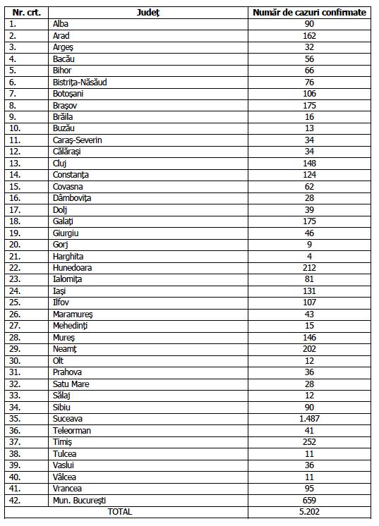 Numărul de cazuri confirmate, pe județe, potrivit raportării Institutului Național de Sănătate Publică: