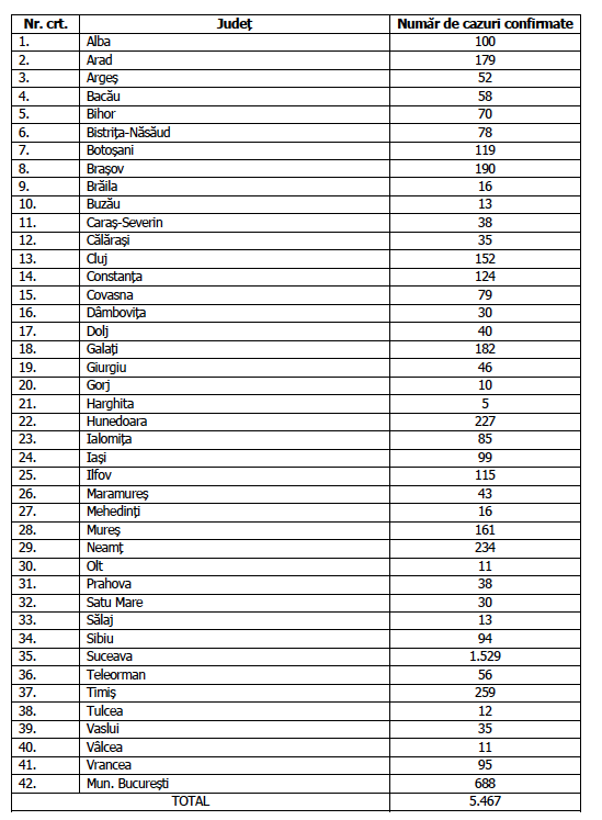 Numărul de cazuri confirmate, pe județe, potrivit raportării Institutului Național de Sănătate Publică: