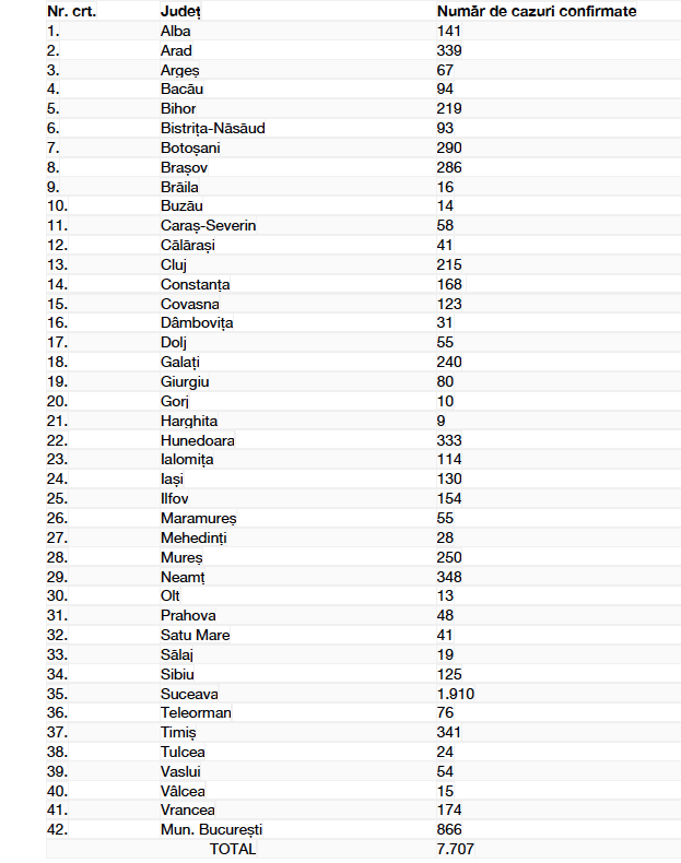 Numărul de cazuri confirmate, pe județe, potrivit raportării Institutului Național de Sănătate Publică: