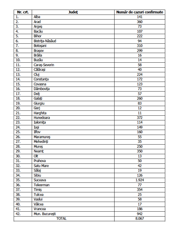 Numărul de cazuri confirmate, pe județe, potrivit raportării Institutului Național de Sănătate Publică: