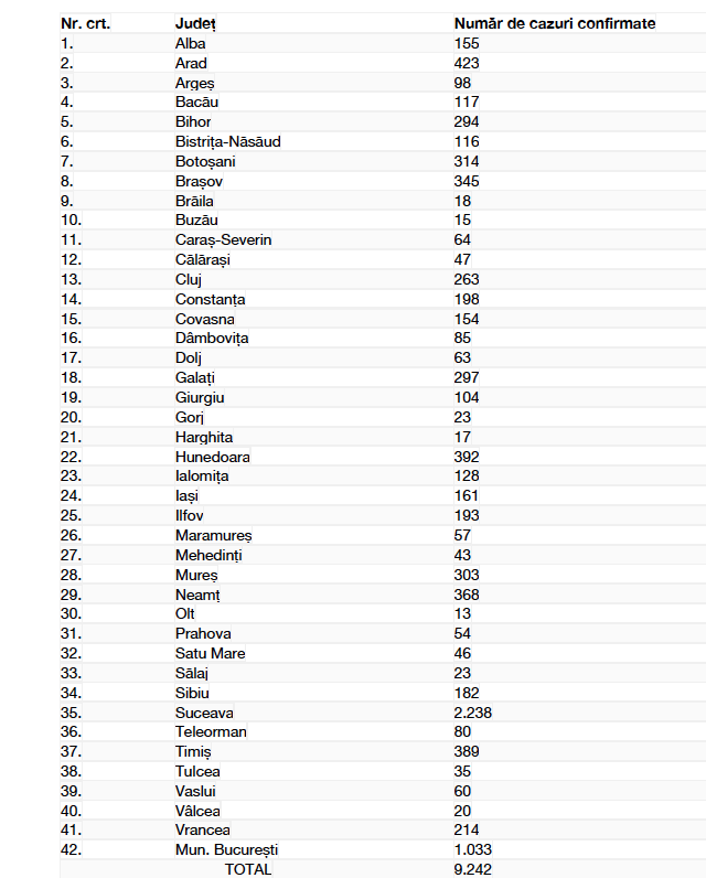 Numărul de cazuri confirmate, pe județe, potrivit raportării Institutului Național de Sănătate Publică: