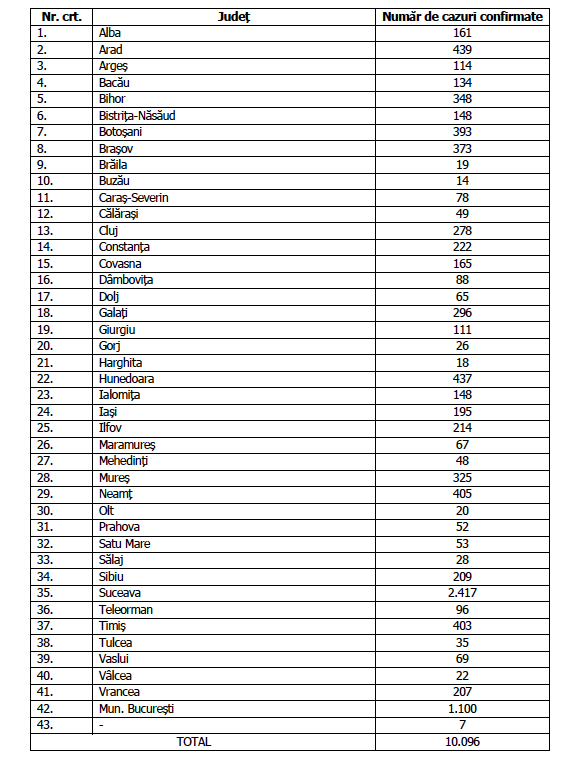 Numărul de cazuri confirmate, pe județe, potrivit raportării Institutului Național de Sănătate Publică:
