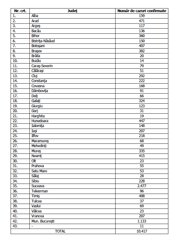 Până astăzi, 24 aprilie, pe teritoriul României, au fost confirmate 10.417 de cazuri de persoane infectate cu virusul COVID – 19 (coronavirus). Dintre persoanele confirmate pozitiv, 2.817 au fost declarate vindecate și externate.