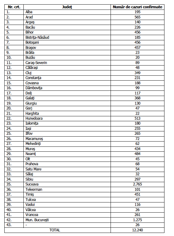 Numărul de cazuri confirmate, pe județe, potrivit raportării Institutului Național de Sănătate Publică: