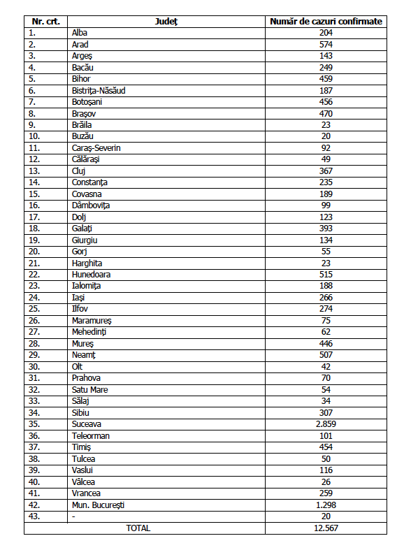 Numărul de cazuri confirmate, pe județe, potrivit raportării Institutului Național de Sănătate Publică:
