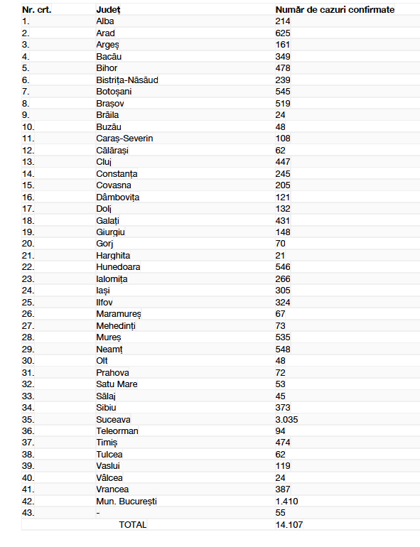Numărul de cazuri confirmate, pe județe, potrivit raportării Institutului Național de Sănătate Publică: