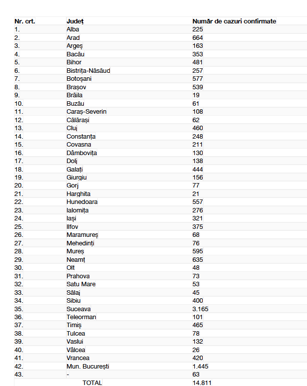 Numărul de cazuri confirmate, pe județe, potrivit raportării Institutului Național de Sănătate Publică: