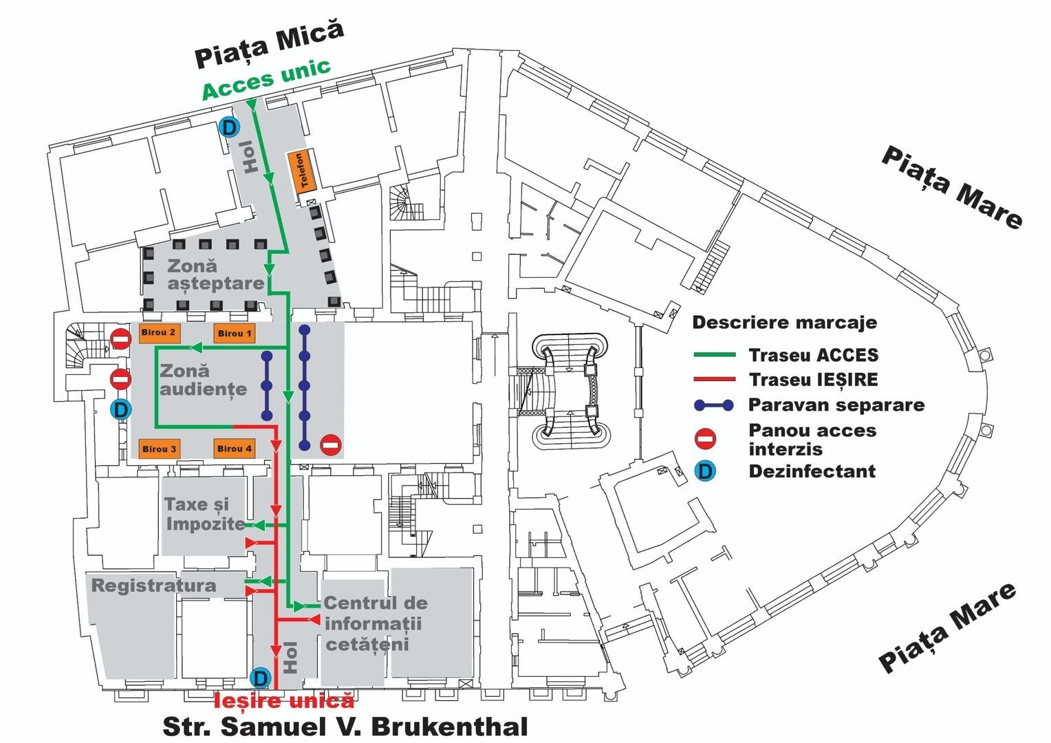 Accesul cetățenilor se va face prin intrarea B, iar ieșirea se va face pe altă cale, spre strada Turismului. Accesul în clădire va fi permis doar dacă cetățenii poartă mască și își dezinfectează mâinile cu gel pus la dispoziție de instituție în dozatoare situate la intrare.