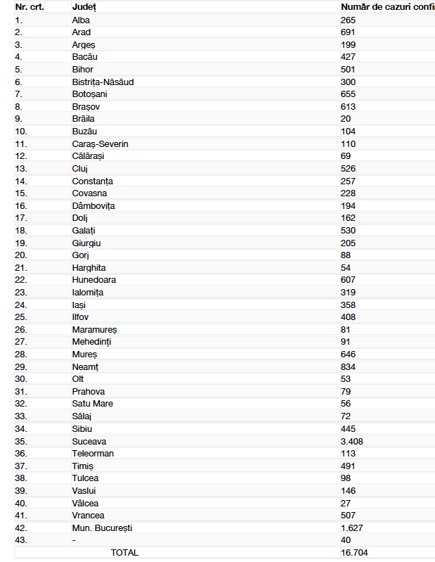 Numărul de cazuri confirmate, pe județe, potrivit raportării Institutului Național de Sănătate Publică: