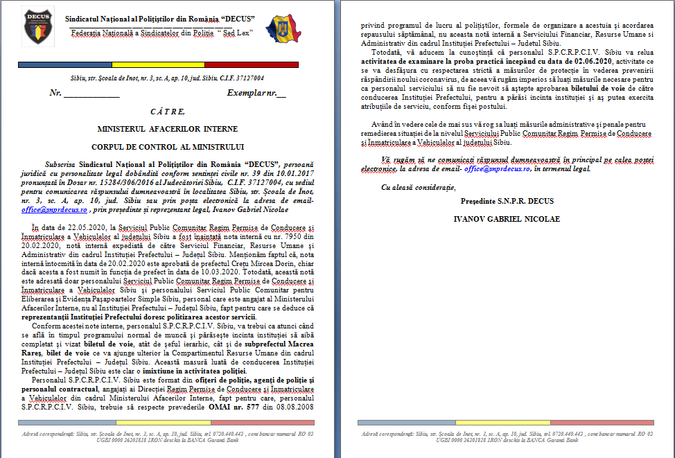 Liderii sindicatului DECUS au trimis şi o scrisoare la conducerea M.A.I. unde au sesizat abuzul comis de prefectul Creţu şi au cerut prezenţa Corpului de Control la Sibiu. „Dom’ prefect sibian/lasfierbinţean, poliţiştii şi personalul contractual din cadrul #SPCRPCIV şi cei de la Paşapoarte sunt în subordinea MINISTERULUI AFACERILOR INTERNE, şi nu în subordinea dumitale! Motiv pentru care (ghinion) nu prea poţi să le dai ordine!” scrie Bănică pe Facebook.