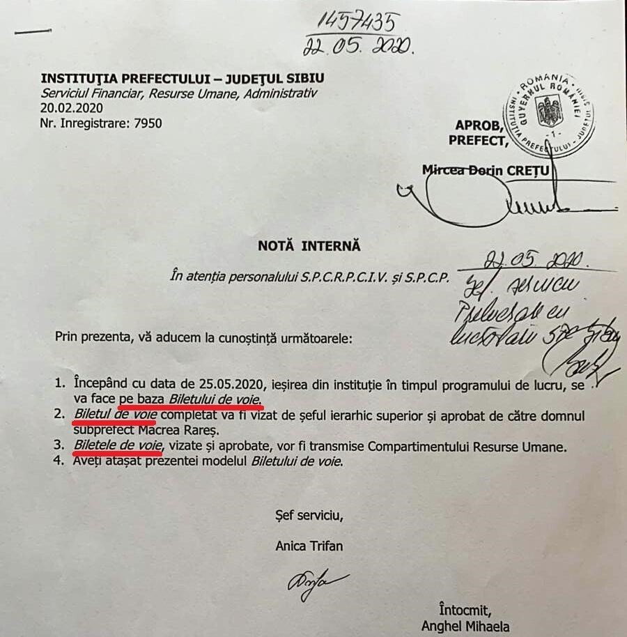 Cu toate că prefectul Creţu a fost numit în această funcţie la 10.03.2020, domnia sa aprobă o notă internă datată 20 februarie, prin care se dispune (ATENŢIE ⚠️) ca angajaţii Serviciului Public Comunitar Regim Permise de Conducere și Înmatriculare a Vehiculelor Sibiu #SPCRPCIV și personalului Serviciul Public Comunitar pentru Eliberarea și Evidența Pașapoartelor Simple Sibiu #SPCEEPS să poată părăsi clădirea doar cu…bilet de voie. 🤦♂️