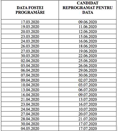 - Candidații programați să susțină proba practica în perioada 17.03.2020-15.05.2020, ale căror dosare expiră după data de 15.05.2020, vor fi reprogramați din oficiu (fără a fi necesară prezența candidatului la ghișeu) de către lucrătorii Serviciului Public Comunitar Regim Permise de Conducere și Inmatriculare a Vehiculelor Sibiu din cadrul Instituției Prefectului – Județul Sibiu, prin proceduri specifice, cronologic, conform tabelului anexat: