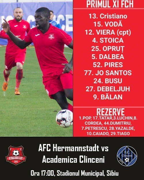 Echipa sibiană joacă astăzi cu Academia Clinceni, meci programat pentru ora 17, meciul de fotbal desfăsurându-se pe stadionul Munincipal din Sibiu.